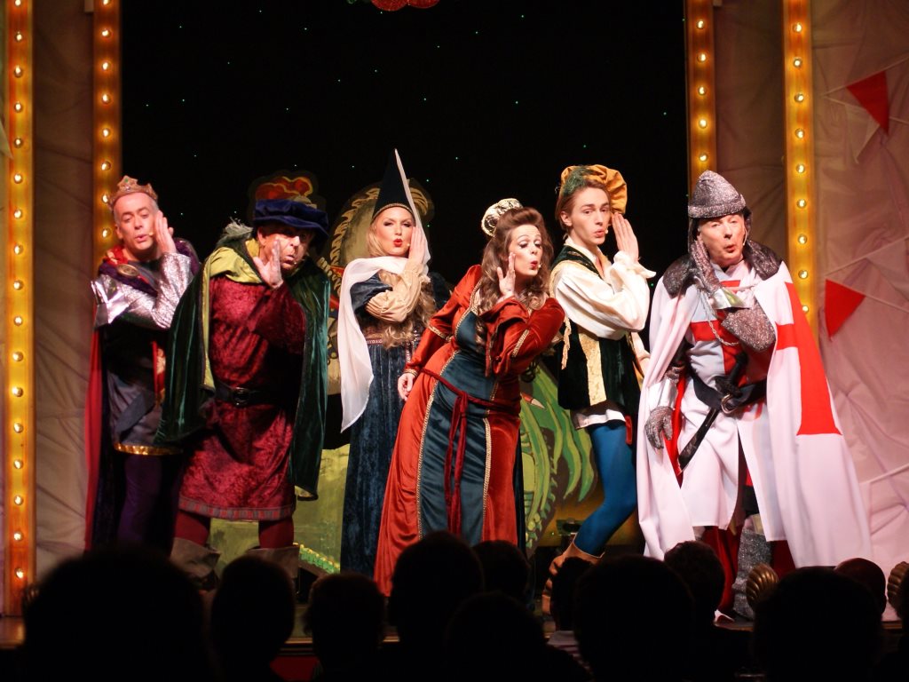 Above, St George’s Day Show 2014 – left to right, Ross Tomlinson, Joni Talks, Vincent Hayes, Bill Byrne, Saskia Brynne, Paul James. Below, the cast perform Monty Python’s Always Look on the Bright Side of Life.